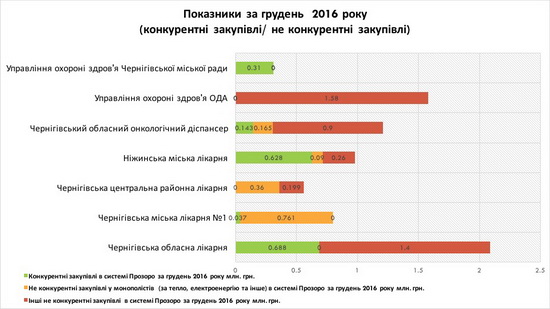 Так Чернігівська обласна лікарня, в грудні уклала не конкурентних договорів на суму 1,4 млн. грн., які не проходять через відкрити торги на прозоро, наприклад: