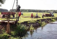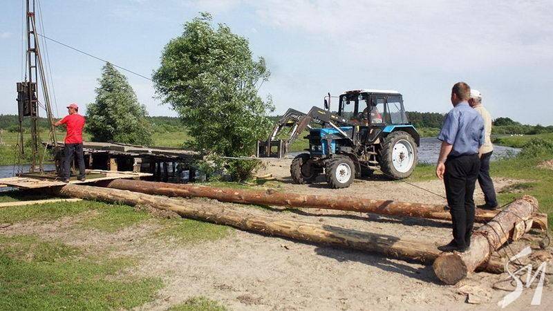 Мостобудівники забили першу палю майбутнього мосту в дно річки. Протягом дня їм вдалося забити ще дві.