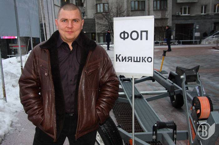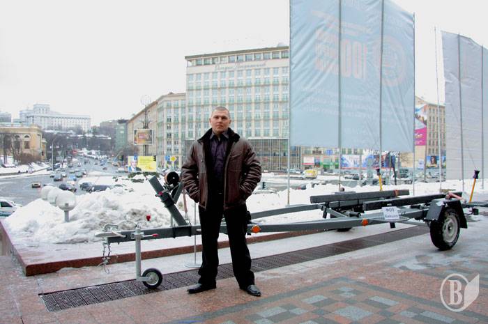 Перед входом до Українського дому відвідувачів зустрічав автопричеп для перевезення човнів. Це продукція чернігівського підприємця Оксани Кияшко.