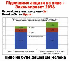 Законопроектами передбачається встановити з 1 червня 2013 року ставку акцизного податку на пиво з солоду (солодове) у розмірі 2,50 грн. за 1 л (замість діючої на сьогоднішній день ставки податку у розмірі 0,87 грн. за 1 л), пропонується визначити, що 65% надходжень до спеціального фонду Державного бюджету України акцизного податку з виробництва та продажу пива в Україні спрямовуються на фінансування будівництва лікарень, в тому числі спеціалізованої лікарні «Охмадит», заходів охорони здоров я, визначених законом про Державний бюджет України.