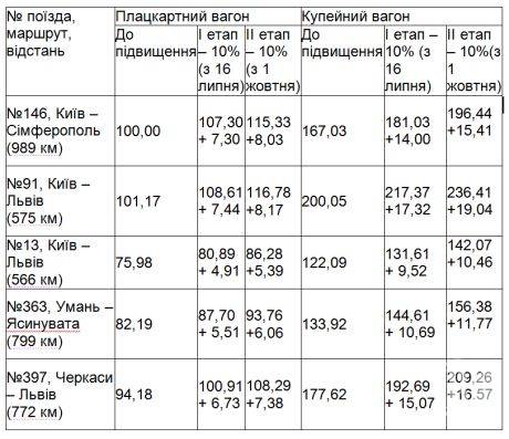 "Вартість подорожі залізницею у внутрішньому сполученні в плацкартному та купейному вагонах наразі підвищилася на 10%, наступний етап – з 1 жовтня вартість зросте теж на 10%", - уточнили в "Укрзалізниці".