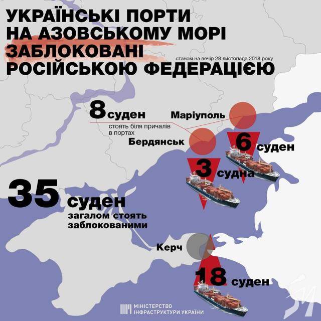 «Станом на вечір 28 листопада 2018 року українські порти Азовського моря Маріуполь та Бердянськ фактично заблоковані Російською Федерацією для заходу та виходу суден», – йдеться у повідомленні.
