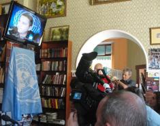 А з українськими миротворцями в Ліберії через Інтернет встановили відеозв’язок. Присутні мали можливість не лише почути, а й побачити офіцерів 56-го окремого вертолітного загону. Про їхні будні розповіли помічник командира загону по роботі зі ЗМІ підполковник В’ячеслав Петровський та начальник командного пункту загону підполковник Вадим Рубан, до речі, теж чернігівець.