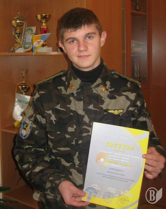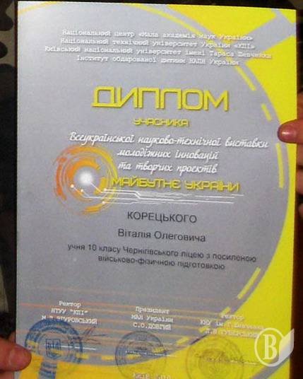 Першокурсник чернігівського ліцею з посиленою військово-фізичною підготовкою молодший віце-сержант Віталій Корецький здобув перемогу на Всеукраїнській науково-технічній виставці молодіжних інновацій та творчих проектів «Майбутнє України».