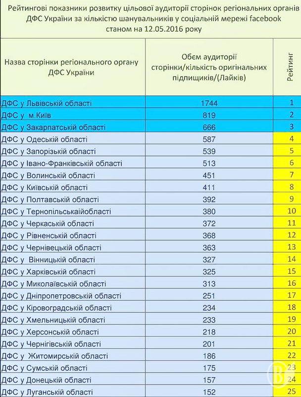 Группа «Мониторинг качества предоставления услуг органами власти» предлагает к рассмотрению рейтинговые показатели развития официальных страниц региональных органов ГФС Украины.