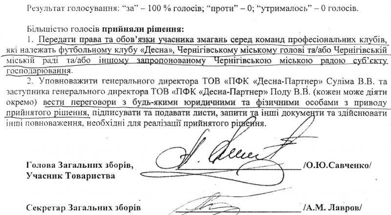 Для подтверждения информации приводим текст Протокола общих собраний участников ООО "ПФЛ "Десна-Партнёр" от 28.11.2008 г., который был предоставлен в пакете документов Черниговскому городскому совету.