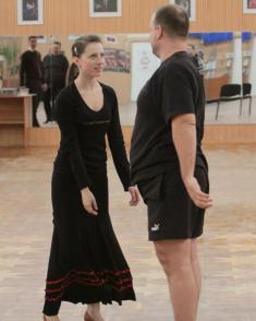Виталий Грыць рассказал, что придя впервые, во второй раз, занимался с тренером, изучал основные шаги и па. А затем тренеры клуба представили ему его партнершу, которая ему, кстати, понравилась. Господин Виталий сказал, что тренеры очень разумно и удачно подобрали ему пару.
