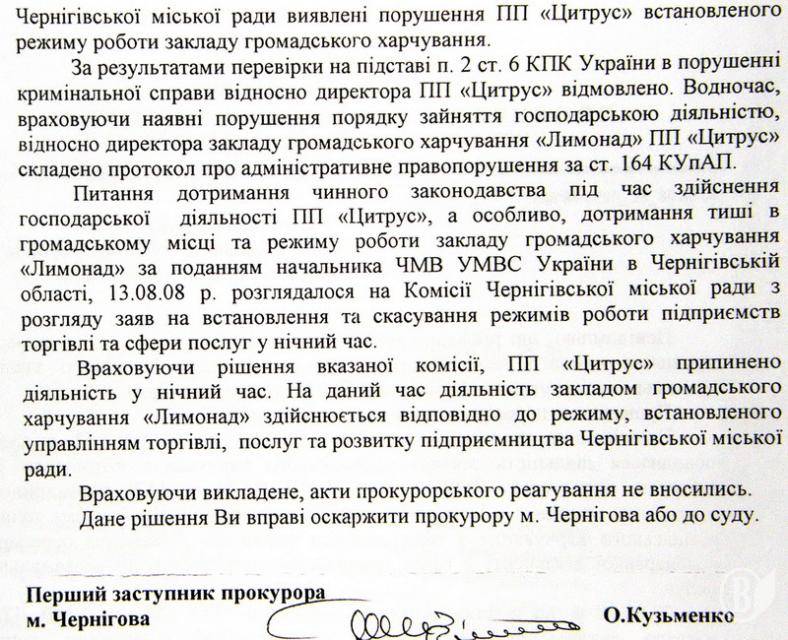 - 12 августа 2009 года состоялось заседание комиссии, которое запретило ночную деятельность клуба, - «Учитывая решение комиссии Черниговского городского совета по рассмотрению заявлений на установление и отмену режимов работы предприятий торговли и сферы услуг в ночное время, ПП «Цитрус» прекращена деятельность в ночное время. Первый заместитель прокурора г.Чернигова Кузьменко О.» - И что вы думаете? «Лимонад» продолжил свою деятельность будто ничего и не случилось.