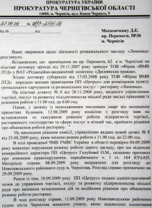 В ходе рассмотрения дела, 11. 09. 09 Новозаводским районным судом г.Чернигова вынесено решение, которым удовлетворено ходатайство истца об обеспечении иска. Первый заместитель прокурора области Е.Ходыко».