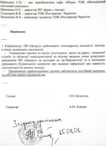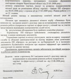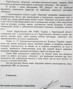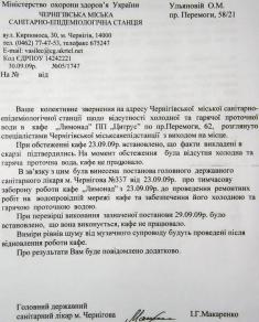 «В связи с тем, что на момент проверки в кафе отсутствовала холодная и горячая вода, вынесено постановление о временном запрещении работы «Лимонада». Главный санитарный врач г.Чернигова И.Макаренко».