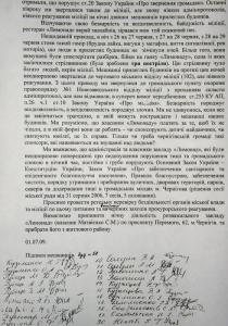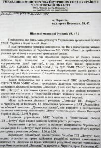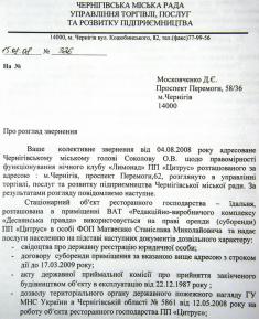«В январе-феврале этого года мы неоднократно обращались к Черниговскому городскому председателю Александру Соколову, но официального ответа не получили еще и до сих пор. Бездеятельность городского совета нарушает ст. 20 Закона Украины «Об обращении граждан». Последние полгода мы обращались также в милицию, но опять никаких админпротоколов, никакого реагирования на ночные звонки жильцов прилегающих домов».