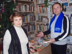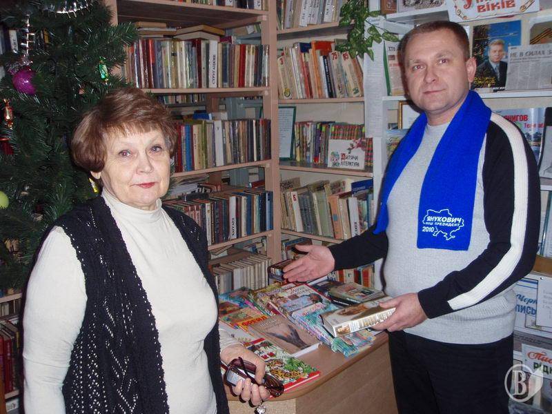 На фото: Депутат міської ради від Партії регіонів Геннадій Багмут вручає книжки бібліотечному пункту ім. Коцюбинського