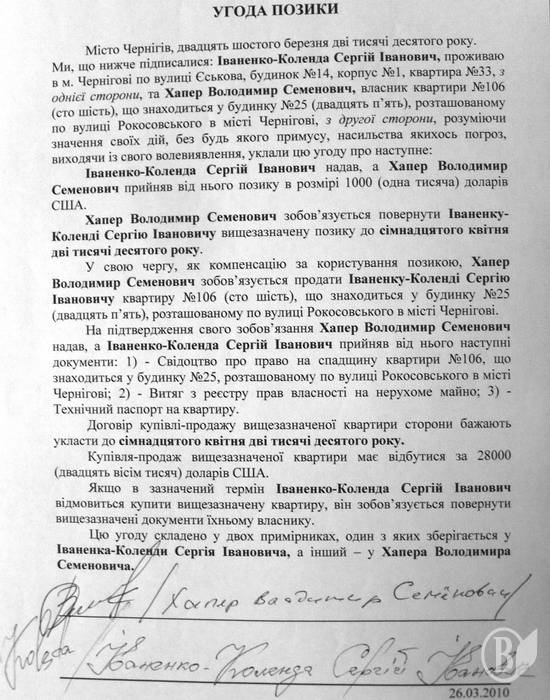 26 березня 2010 року пересічні жителі Чернігова зі звичайнісінькими українськими прізвищами Іваненко та Хапер уклали та підписали між собою угоду, згідно з якою Іваненко надав Хаперу тисячу доларів США, а Хапер зобов’язався продати Іваненку свою квартиру на взаємовигідних умовах за 28000 доларів США.