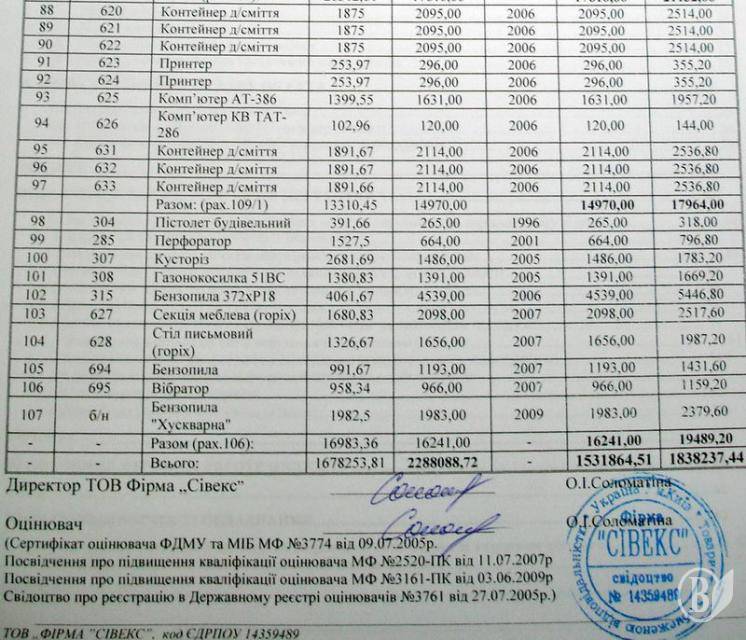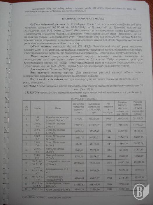 Залучена інвестором фірма-оцінювач «Сівекс» оцінила всю вартість комунального майна в цілих 1838237,44 грн. (один мільйон вісімсот тридцять вісім тисяч двісті тридцять сім гривень 44 копійки). Не дивлячись на те, що тільки балансова вартість цього майна на жовтень 2009 року була на 450 тисяч гривень більшою!