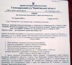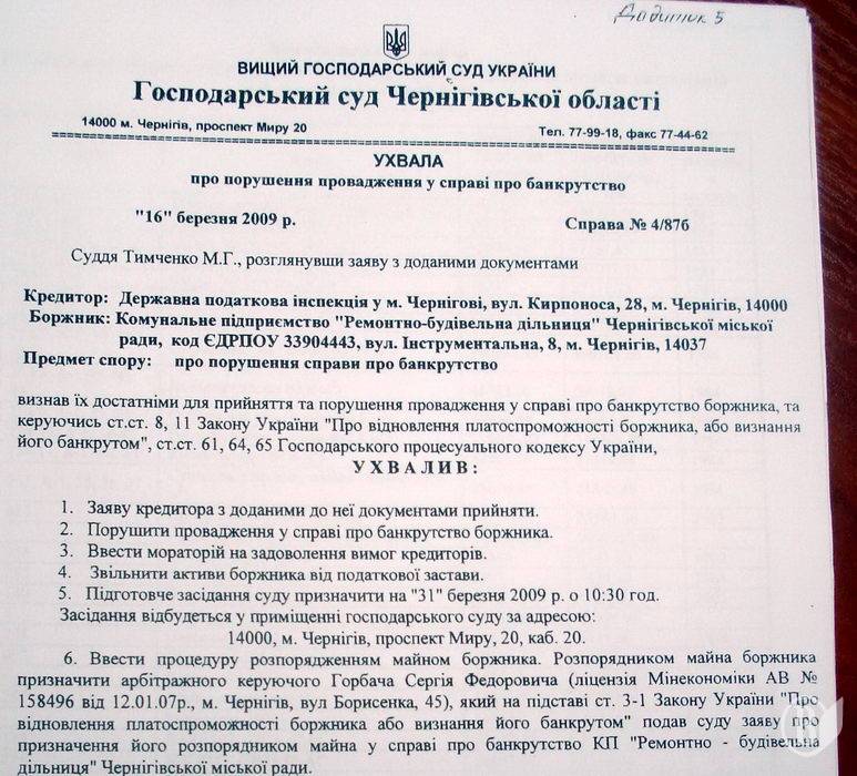 16 березня 2009 року суддя господарського суду Чернігівської області Тимченко М.Г. виніс ухвалу про порушення провадження у справі про банкрутство КП «Ремонтно-будівельна дільниця» Чернігівської міської ради, код ЄДРПОУ 33904443, вул. Інструментальна, 8, м. Чернігів, 14037.