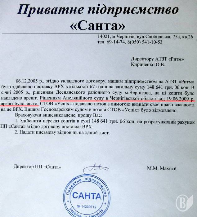 5. «Важливо те, що за усною домовленістю з селянами ПП «Санта» мав повернути їм гроші за передану йому ВРХ лише після розрахунків «Ритму». І це замість того, щоб взяти товар і одразу розрахуватися за нього з селянами. Хоча в принципі такі «відстрочки платежу» і дозволені законодавством, але питання права «Санти» торгувати петрушинською худобою залишається сумнівним.» Шановний автор навіть виражає сумнів в законодавстві України. Він пише що законодавство дозволяє, але тут же виражає сумнів. Тобто сумнів автора вище закону України. Буває.