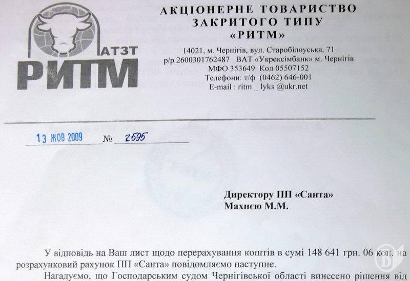 Ще раз наголошую, кожне слово я можу підтвердити документально. Я впевнений, АТЗТ «Ритм» просто використовує усі хитрощі тільки для того, щоб не віддавати гроші. Кожній здравомислячій людині ситуація зрозуміла. АТЗТ «Ритм» повинен віддати гроші ПП «Санта». Далі ці гроші повинні потрапити в с.Петрушин. А ми вже тут з усіма необхідними органами розберемось чиї це гроші. А то в останній час розвелось дуже багато «добродіїв», котрі ділять чужі гроші. Питається, з якого лиха АТЗТ «Ритм» лізе до справ в с.Петрушин? Справа АТЗТ «Ритм» проста, отримали худобу - розрахуйтесь. Ну і на залишок, прошу на майбутнє автора статті спиратися тільки на факти, а не на чиїсь домисли.