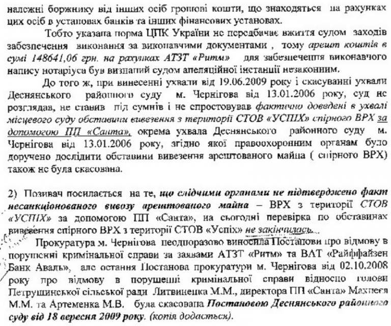 7. «Банк, намагаючись повернути хоча б частину грошей, наданих в кредит, передає справу на розгляд суду. В результаті кошти на рахунку «Ритму», призначені для оплати спірних корів, заморожено на користь банку». Дивує нас автор з кожною фразою. Як це можна заморозити кошти на чиюсь користь? Навіщо ж тоді заморожувати? Крім того, господарським судом м. Чернігова встановлено, що СТОВ «Успіх» не має жодного відношення до цієї худоби, а значить що і банк «Аваль» теж не може жодним чином претендувати на ці кошти. Також в світі рішення суду ця фраза виглядає зовсім безглуздою - «також судом визнано факт несанкціонованого вивозу майна з території підприємства СТОВ «Успіх» за допомогою ПП «Санта». Адже це майно було арештоване за борги перед банком».