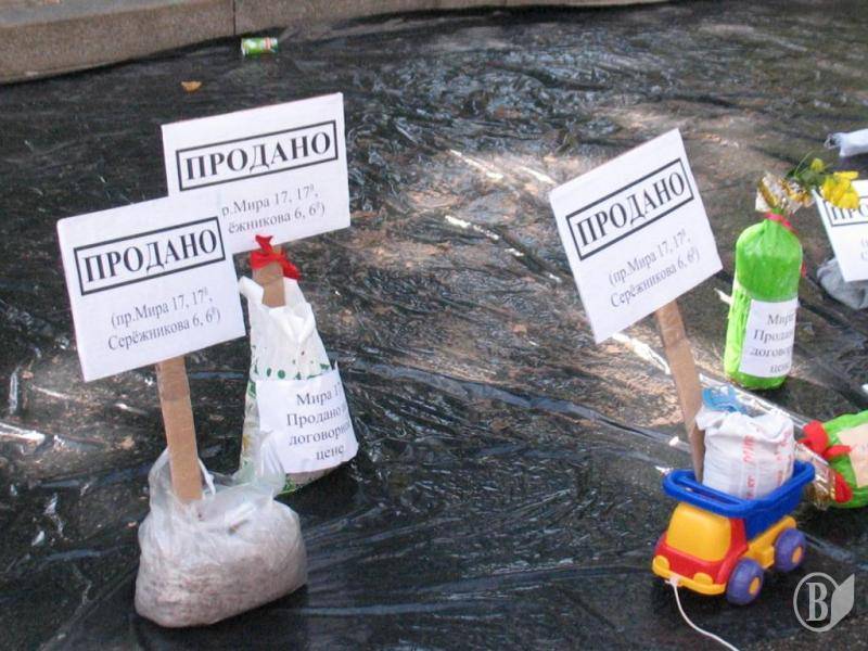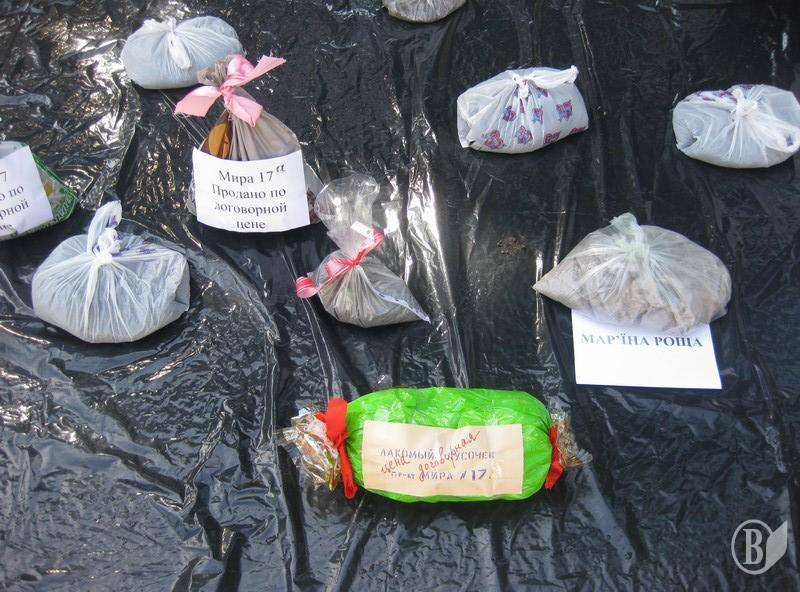 Протестуючі у вигляді театралізованого дійства наочно показали глибину земельної корупції в депутатському середовищі міськради. Вони принесли у торбинках землю: «депутат» торгував земельними ділянками, а «бізнесмен» за долари її купував.