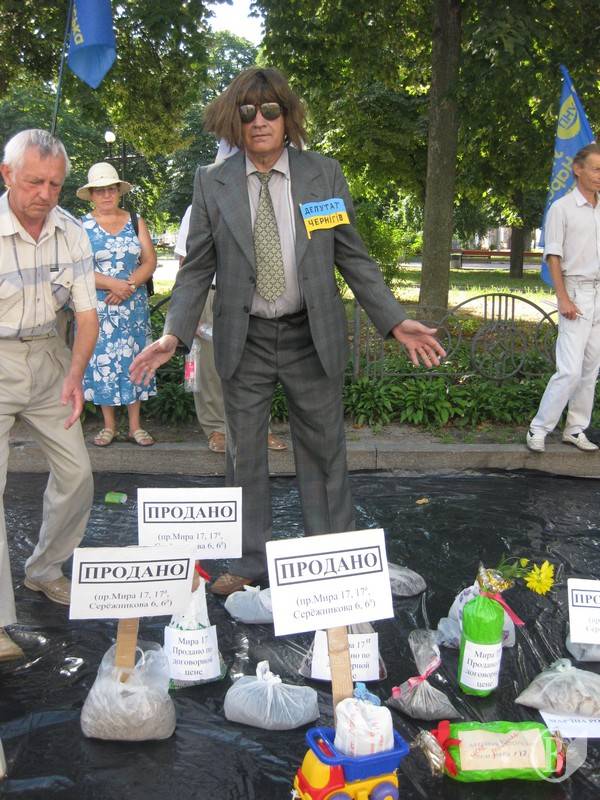 «Ганьба депутатам», «Зупинимо незаконні дії депутатів», «Збережемо історичні куточки нашого стародавнього міста» – саме такими гаслами учасники акції протесту зустріли 30 липня 2010 року депутатів Чернігівської міської ради, які збиралися на чергову сесію.