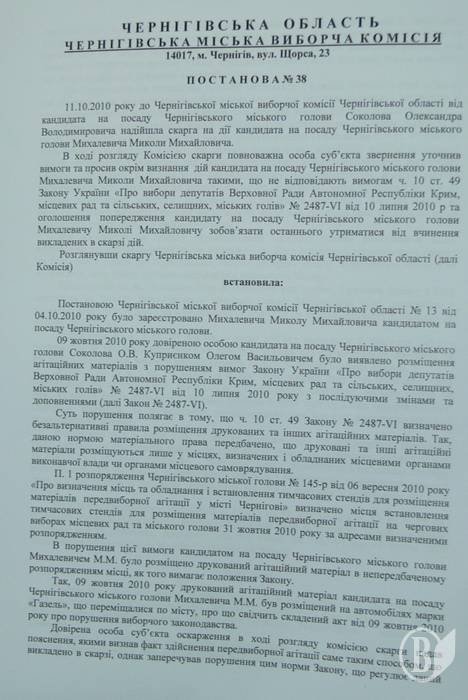 Мова, зокрема, йшла про розміщення в місті зображень та друкованої продукції кампанії «Місто до ладу», яку проводить цей кандидат, організовуючи суботник 16 жовтня.