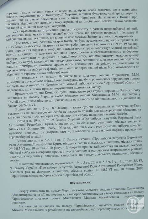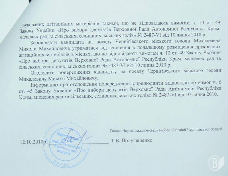 Чернігівська міська територіальна виборча комісія винесла ще два попередження кандидату на посаду міського голови Миколі Михалевичу.