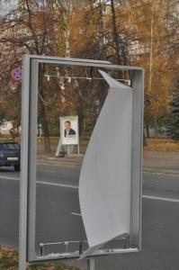 У неділю, 24 жовтня, невідомі вщент розбили рекламні щити кандидата на посаду міського голови Олександра Кириченка та Народної партії по проспекту Миру. Кілька плакатів було вкрадено.