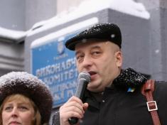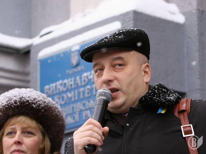 Перед мітингуючими під дверима сірої будівлі виступив депутат міської ради В’ячеслав Лебідь.