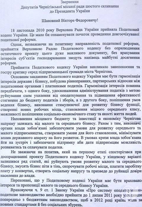 30.11.2010 Чернігівська міськрада просить Президента ветувати Податковий кодекс. Офіційно