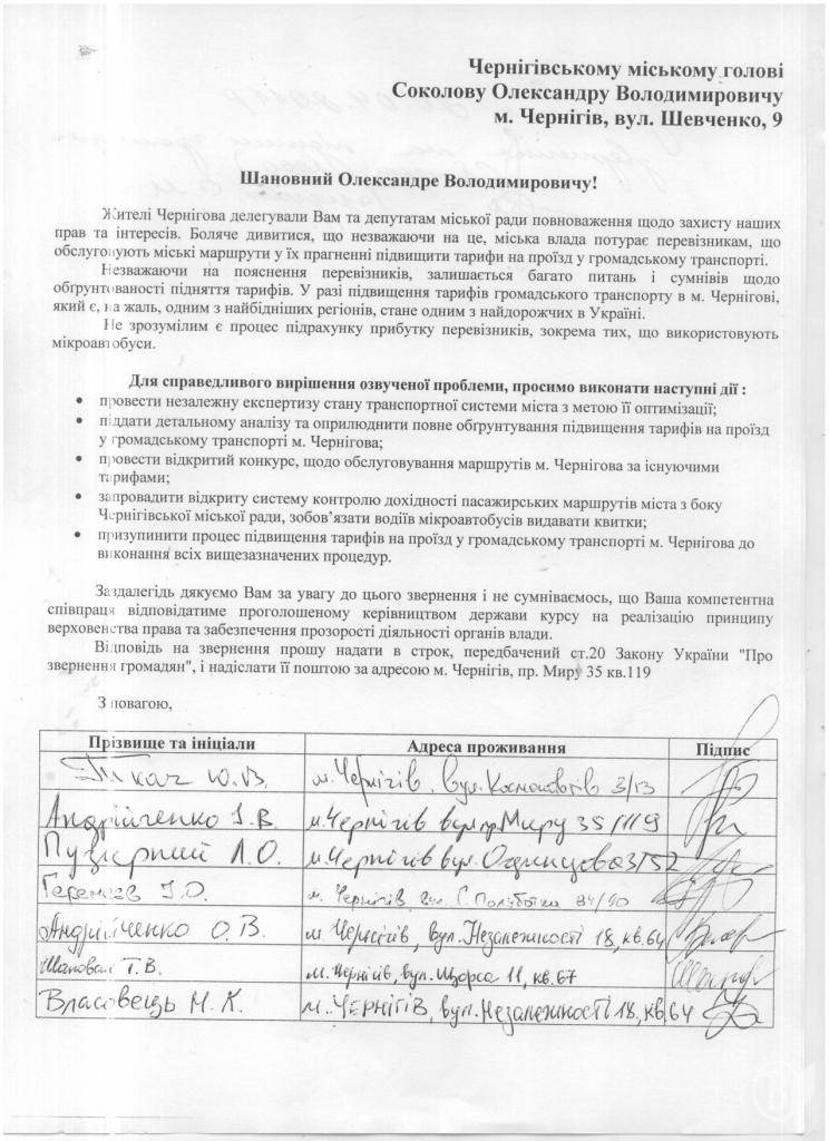 20 квітня 2011 року на ім’я міського голови Олександра Соколова було направлено колективне звернення де дві тисячі чернігівців виклали свої пропозиції яким чином можна уникнути підвищення вартості проїзду у міському пасажирському транспорті.