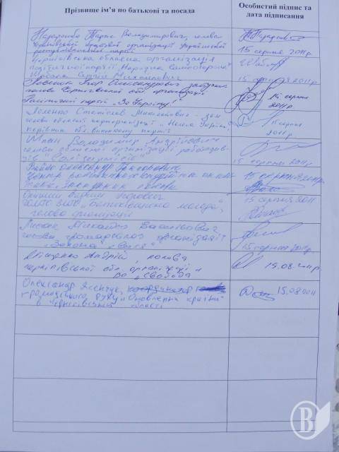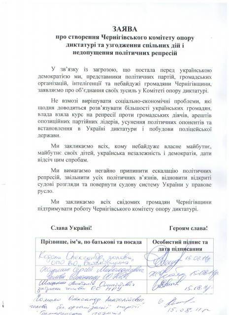 Присутні підписалися під заявою про створення Чернігівського комітету опору диктатурі та узгодження спільних дій і недопущення політичних репресій. Це зокрема ВО «Батьківщина», Партія «Реформи і порядок», Народний рух України, Громадянська позиція, Народна самооборона, Наша Україна, Свобода, Українська республіканська партія, громадський рух «Оновлення країни», організація роботодавців «Солідарність», Громадська організація «Батьківщина молода», Громадська організація «Центр політичних студій та аналітики», Громадська організація «Зелена хвиля».