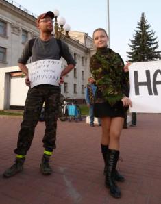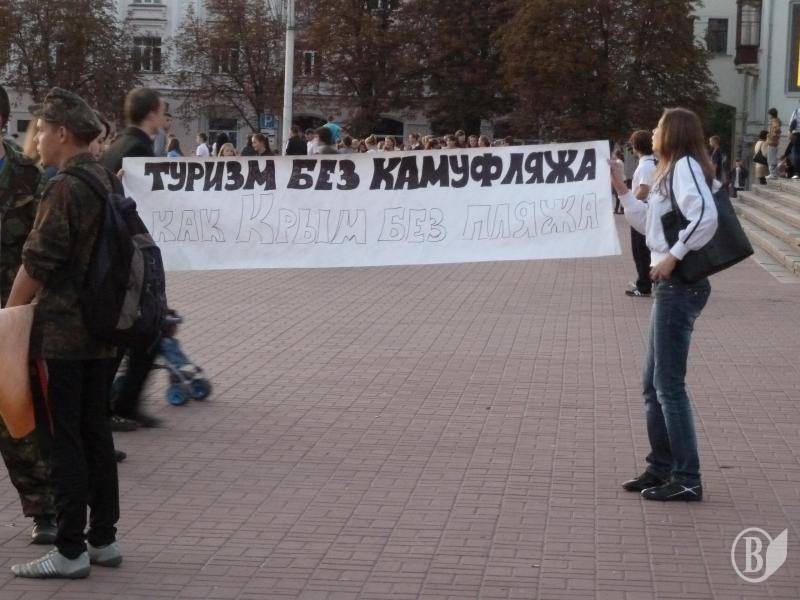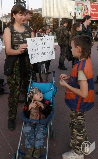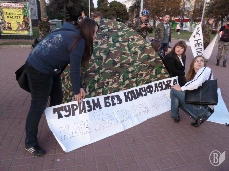 "Туризм без КАМУФЛЯЖА как Крым без пляжа", "Нам не нужен эпатаж, наша форма - камуфляж", "Нас не потрібно роздягати", - такими були гасла активної молоді Чернігова під час акції, яка не мала на меті висловлювати підтримку жодній політичній силі чи організації.
