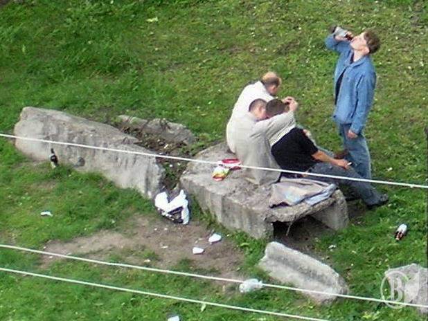 Що залишається на місці тих «бенкетів», Ви теж мабуть знаєте прекрасно. Обгортки, пляшки, бите скло, недопалки, відірвані хвости тварин, шприци, використані «гумові вироби», рештки «закусі» тощо. Зливається «перероблена» на сечу тими організмами алкогольна жижа тут же, поряд з доріжками, дитячими майданчиками, парковкою.