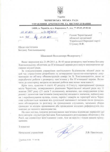 У відповіді Управління архітектури та містобудування міської ради зазначено, що повернення пам’ятника Богдану Хмельницькому обличчям до П’ятницької церкви неможливо через затвердження проектно-кошторисної документації і відсутності громадського обговорення питання по об’єкту. Але головне, на думку управління, що існуюче розташування пам’ятника мабуть «відповідає первісній ідеї його авторів: скульптура Богдана Хмельницького розташована обличчям у бік Росії, що символізує возз’єднання з нею».