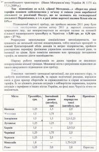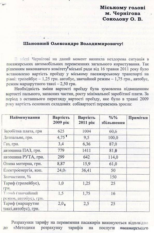 «Необхідність зміни вартості проїзду була зумовлена підвищенням вартості пального, запасних частин, росту мінімальної заробітної плати» - також нижче приводиться таблиця з переліком статей витрат та відсотками збільшення вартості. В цій таблиці вказано рівень середньої заробітної плати в різні роки.