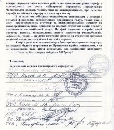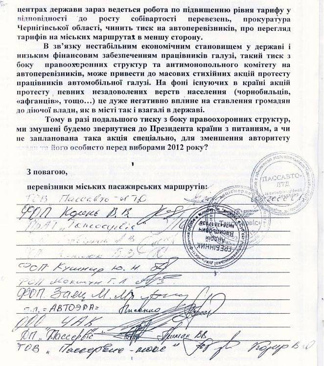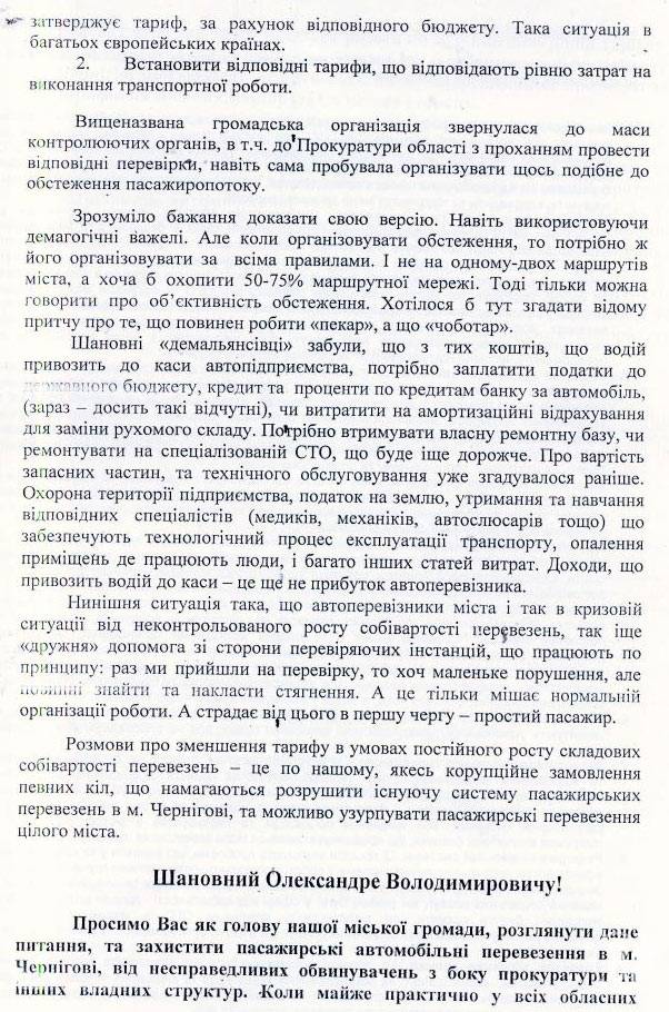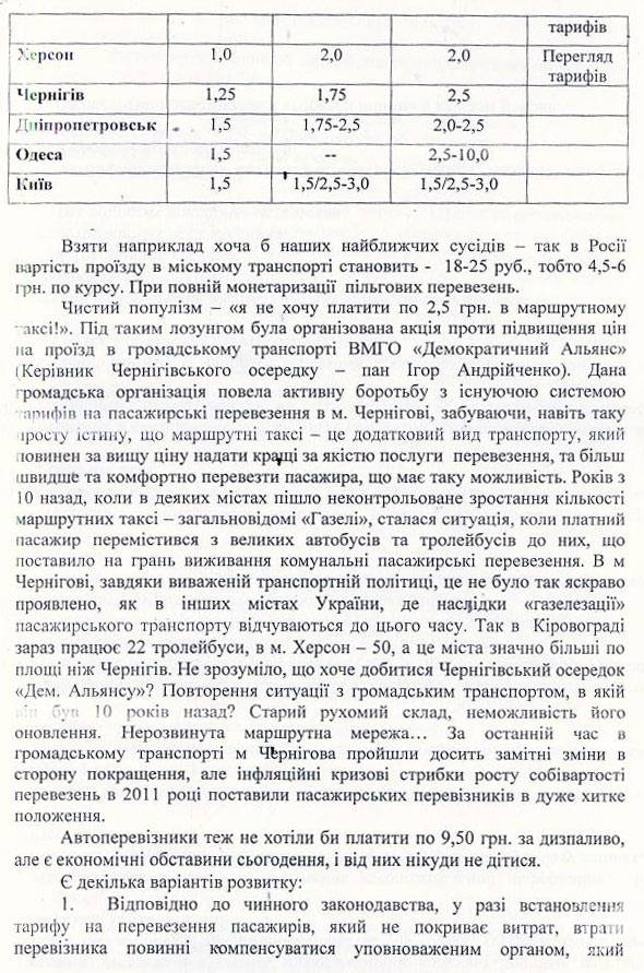 І на останок «Шановний Олександре Володимировичу! Просимо Вас як голову нашої міської громади, розглянути дане питання, та захистити пасажирські автомобільні перевезення в м. Чернігові, від несправедливих обвинувачень з боку прокуратури та інших владних структур. Коли майже практично у всіх обласних центрах держави ведеться робота по підвищенню рівня тарифу у відповідності до росту собівартості перевезень, прокуратура Чернігівської області, чинить тиск на авто перевізників, про перегляд тарифів на міських маршрутах в меншу сторону» - оскільки зрозуміло, що міський голова не має і не може мати важелів впливу на контролюючі органи, то Демократичний Альянс сприймає даний лист як підготовку перевізників до наступного підвищення тарифів на проїзд вже в 2012 році. Тим більше, що в офіційному віснику Чернігівської міської «Чернігівські відомості» в планах роботи на 2012 рік стоїть питання про «Перегляд вартості проїзду в міському транспорті» і заступник міського голови О.Буцко в інтерв’ю повідомив, що вартість проїзду в СІЧНІ підвищуватися не буде, а потім?