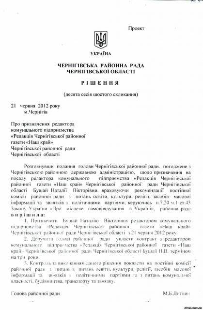 Чернігівська обласна організація Національної спілки журналістів України звертається з проханням до засновників газети - Чернігівської районної ради та Чернігівської районної державної адміністрації – при вирішенні питання про призначення редактора Чернігівської районної газети «Наш край» врахувати думку третього засновника газети – трудового колективу редакції. Також ми розраховуємо, що при призначенні редактора засновники керуватимуться професійними якостями претендентів.