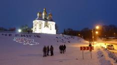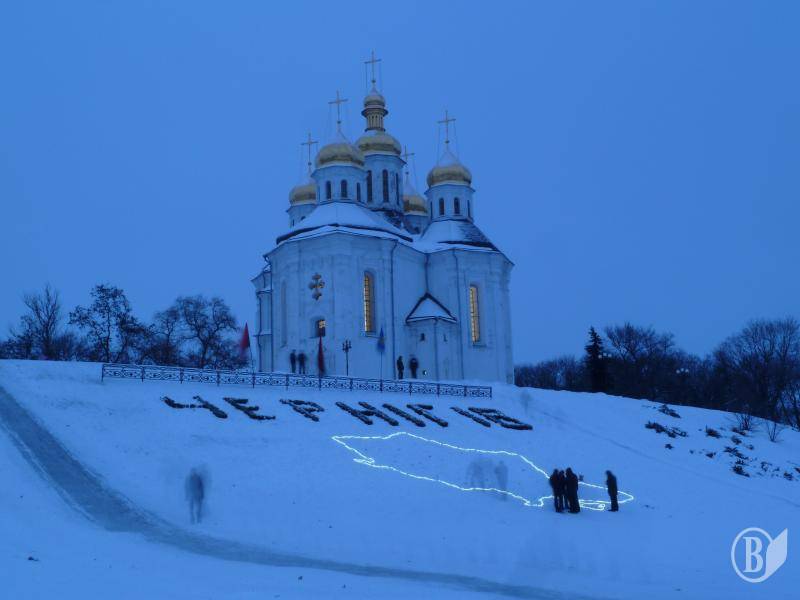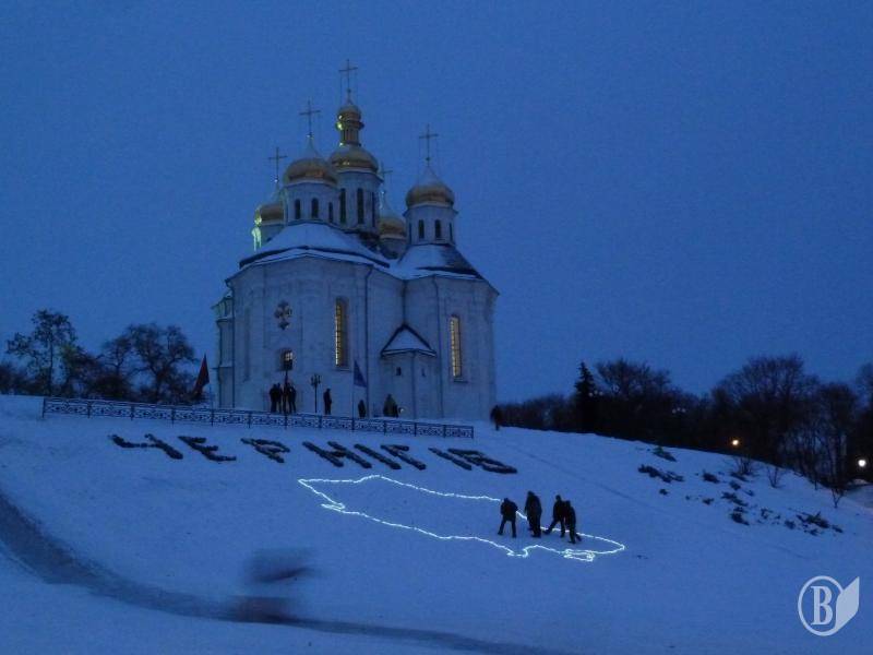 Всередині окресленого контуру активісти запалили лампадки, які символізують міста - обласні центри україни і адміністративні центри українських територій поза межами сучасних кордонів України.