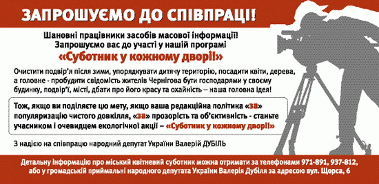 ЗМІ можуть використати наведені нижче адреси чернігівських дворів для об’єктивного висвітлення заходу, який відбуватиметься 20-го квітня.
