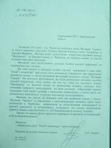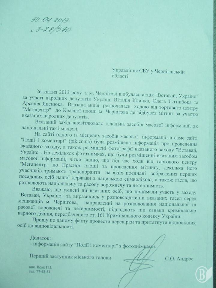У соцмережі Фейсбук з'явився цікавий документ - звернення в СБУ першого заступника чернігівського міського голови регіонала Сергія Андроса зі скаргою на опозиційний антифашистський плакат з акції "Вставай, Україно!".