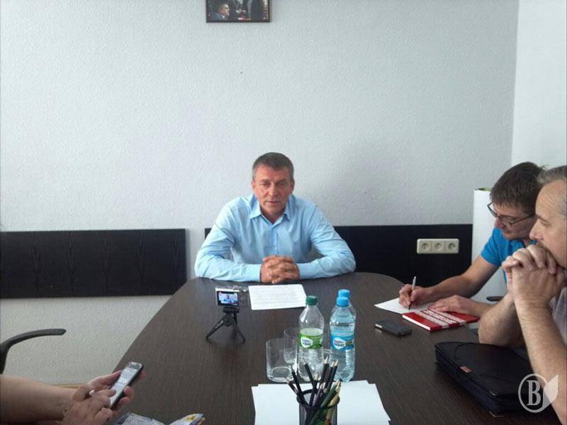 Присутній на брифінгу (наближений до чиновника на фото) Павло Пущенко (у синій футболці) зауважив, що Андрос порушив дві статті закону. Посадовець порадив писати заяву у прокуратуру.