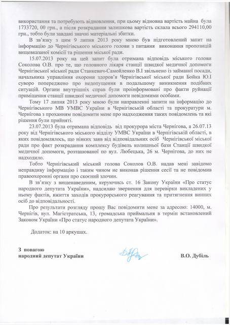 - Дев’ятого липня я надіслав запит Чернігівському міському голові Олександру Соколову, де просив відповісти на питання: як виконуються пропозиції комісії. Вже 15 липня Олександр Соколов у відповіді повідомив, що головного лікаря Вероніку Станкевич-Самойленко звільнено із займаної посади, а начальник управління охорони здоров’я Чернігівської міської ради Юрій Бойко отримав суворе попередження про недопущення в подальшому виникнення подібних ситуацій. Також у листі зазначено, що органи внутрішніх справ були поінформовані про факти руйнації приміщення станції швидкої медичної допомоги невідомими особами, — коментує Валерій Дубіль. — Водночас Чернігівський міський відділ УМВС України та прокурор міста на мій запит щодо поінформованості у цій справі відповіли: мовляв, жодних заяв від відповідальних осіб Чернігівської міської ради про факт розкрадання комплексу будівель колишньої бази Станції швидкої медичної допомоги, розташованої на вул. Любецька, 26 м. Чернігова, до них не надходило.