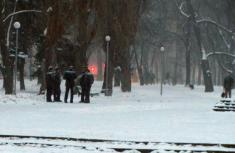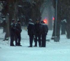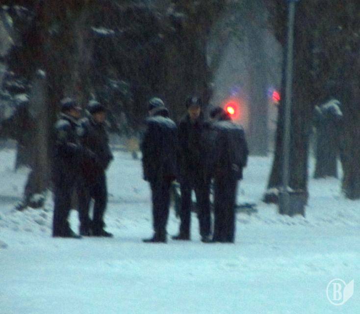 Правоохоронці мерзнуть під снігом, але наказ є наказ.Щоб зігрітися вони розмовляють поміж собою. Але замовкають при наближенні потенційно можливих нападників на символ радянської влади і прискіпливо оглядають чоловіків.