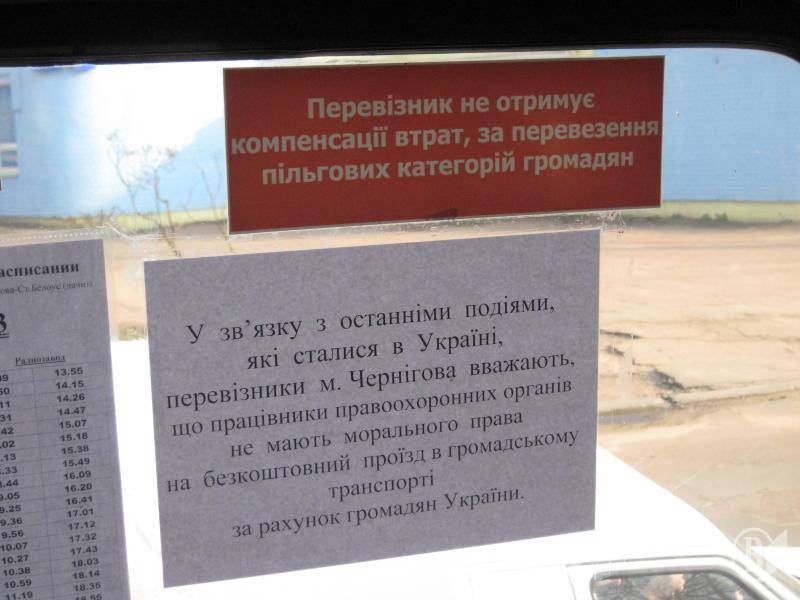 Тепер у чернігівських маршрутках висять оголошення «перевізники м. Чернігова вважають, що працівники правоохоронних органів не мають морального права на безкоштовний проїзд у громадському транспорті за рахунок громадян України».