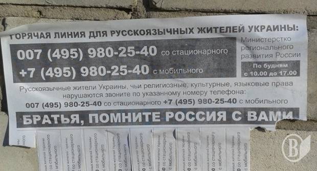 Вихідними місто прикрасили агітаційними листівками: "Російськомовні жителі України, чиї релігійні, культурні та мовні права порушують, звертаєтеся за наведеними номерами".