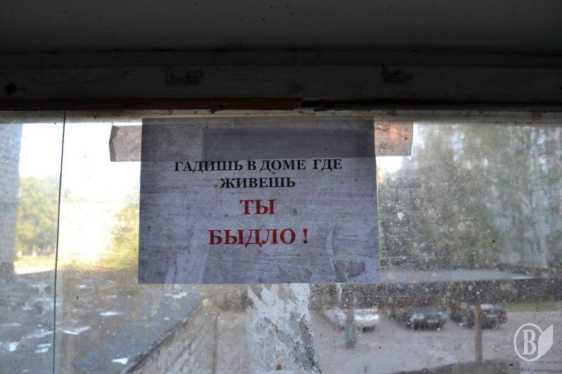 В дополнение ко всему этому, надпись на одном из окон: «Гадишь в доме, где живешь - Ты быдло!», выглядела весьма комично.