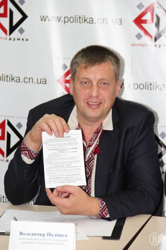 Михайло Чейпіш як представник Майдану висловив всіляку підтримку кандидату в народні депутати від 206 округа Володимиру Поліщуку, який створив проект «Люстраційного бюлетеня», що успішно випускається в Чернігові. Сам кандидат переконаний - люстрація повинна мати представництво в Верховній Раді, адже керівники міняються, а схеми залишаються.
