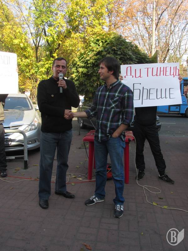 Разом з десятком своїх прибічників, озброївшись транспарантами на кшталт "Дитинець - рупор кремлівської пропаганди" демонстранти хотіли висловити своє "фе" редакційній політиці каналу.