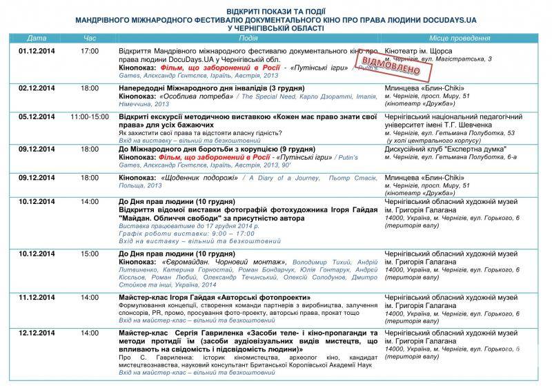 Неожиданностью нынешнего Путешествующего фестиваля стал отказ Черниговкино (кинотеатр Щорса) в показе фильма «Путинские игры», который запрещен в России. Отказ мотивировали показами других фильмов, не считаясь с тем, что была предыдущая договоренность о снятии планового фильма, который должен был показываться в это время.