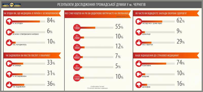 Те ж соціологічне опитування показало, що лише 16% чернігівців проти переходу на страхову медицину, 10% байдуже це питання, а більшість — 74% — цілком підтримують ідею, тим паче, що багато послуг у лікарнях вже платні.